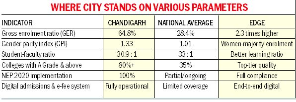Chandigarh’s higher education ecosystem has set new national benchmarks, outperforming India’s averages on every measurable parameter — from enrolment and gender balance to research capacity, infrastructure growth and reform implementation.